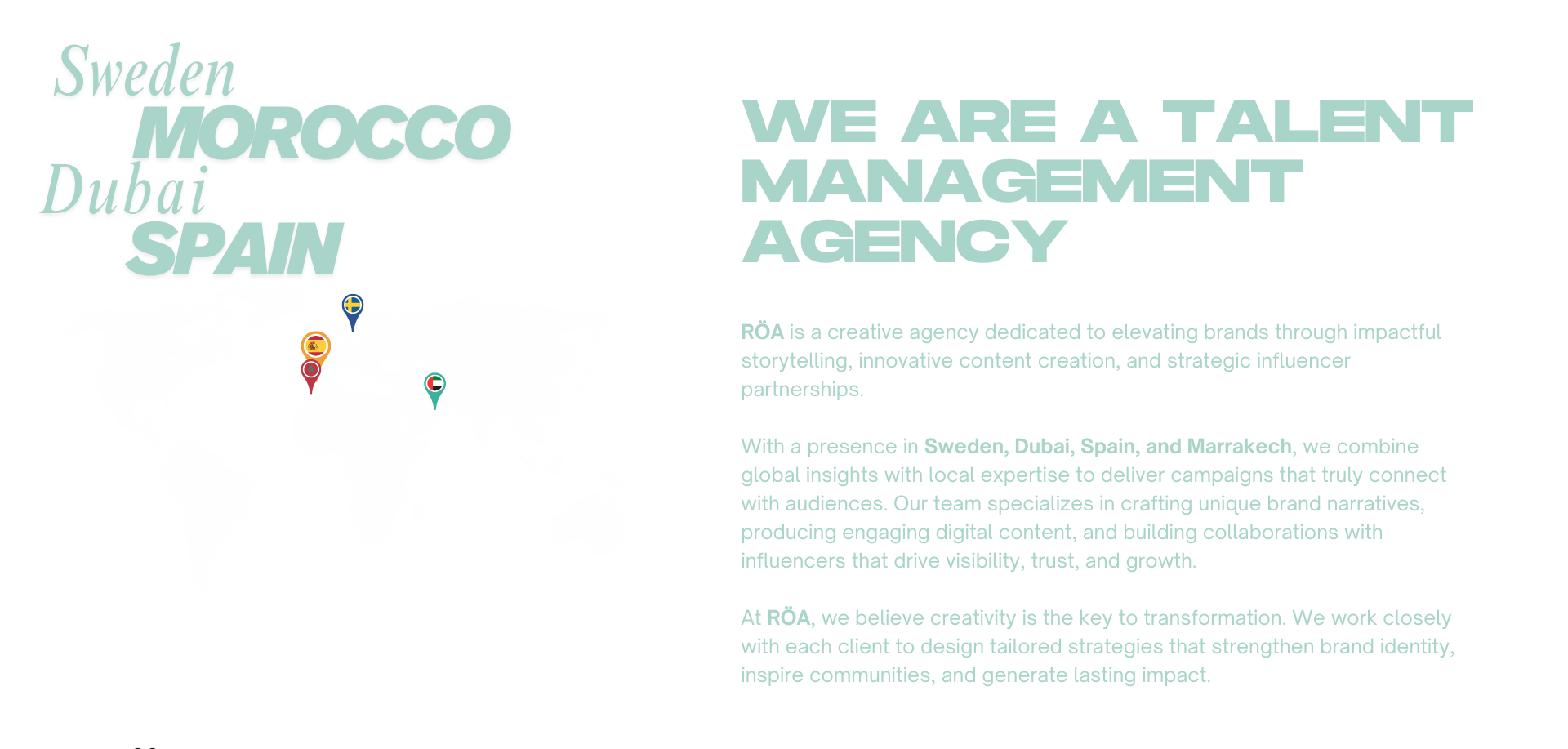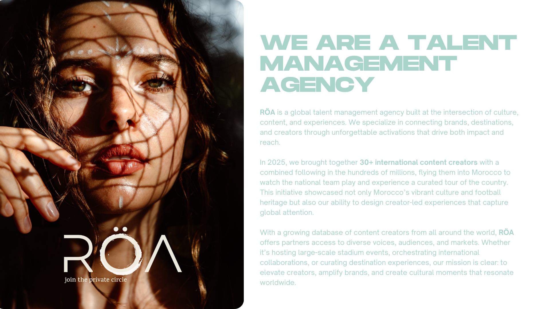 At RÖA, we believe influence has no borders. We manage creators from every corner of the globe and connect them with brands that want more than just clicks, they want cultural impact.Our global team negotiates, strategizes, and delivers deals that maximize revenue for creators and ROI for brands.